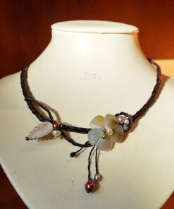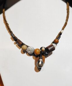 Collier en fibre végétale marron, nacre, pierres de lune, perles d’eau douce, onyx, biwa