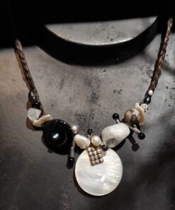 Collier en fibre végétale noire, nacre et perles d’eau douce
