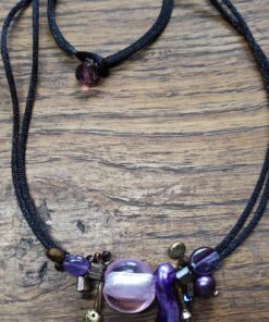 Collier en en satin noir avec améthyste,perles de rivière et de verre