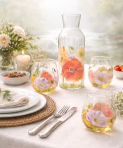 Pichet d’un litre avec 3 anémones peintes tout autour. vous pouvez avoir aussi les verres assortis pour une collection complète. compliment assuré de vos invités pour une table unique.
