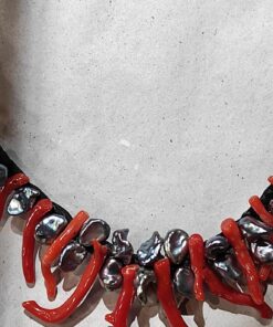Collier tressé en rafia , Corail rouge et perles de rivière